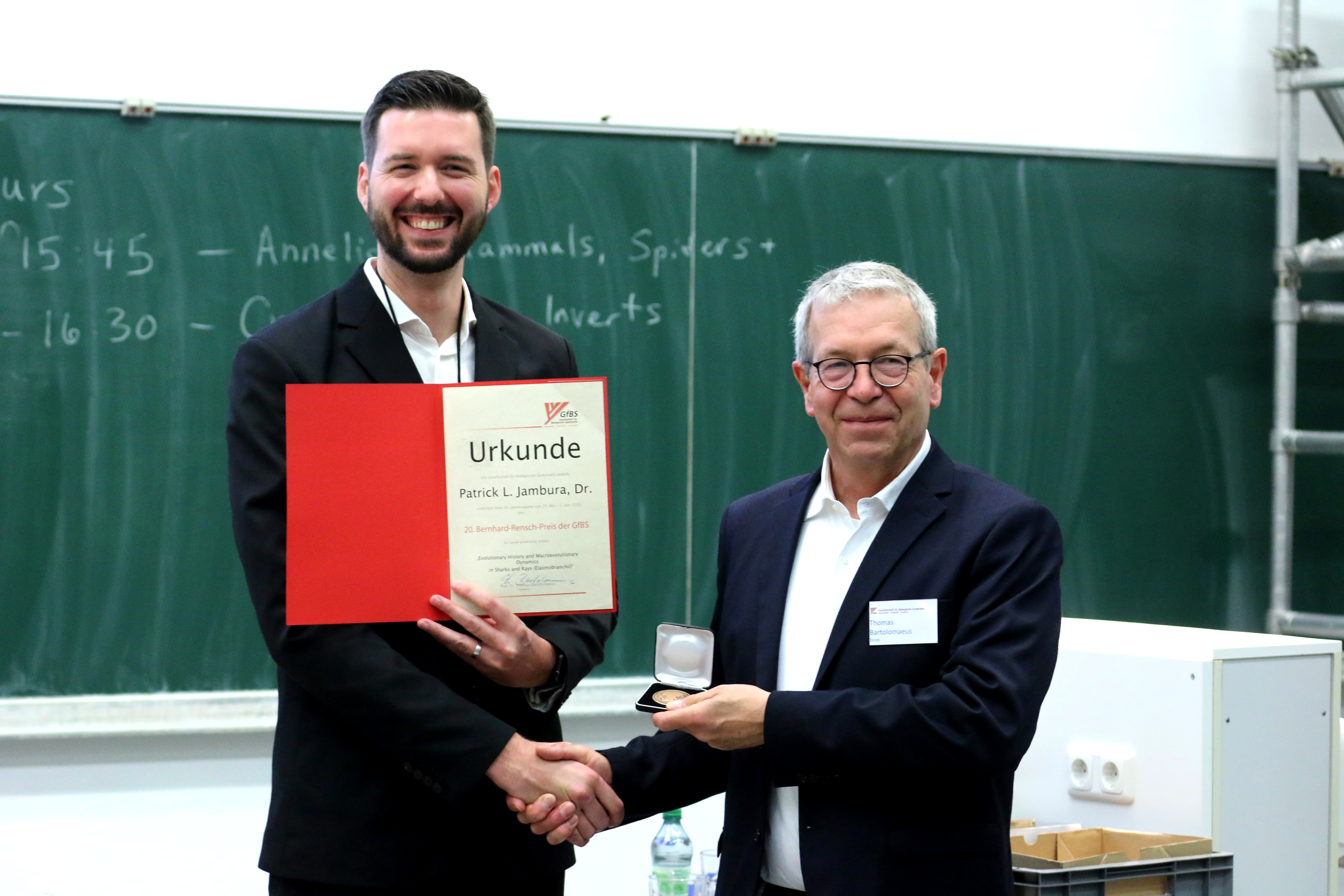 Dr. Patrick Jambura (Universität Wien) erhielt die Auszeichnung seine Dissertation mit dem Titel Evolutionary history and macroevolutionary dynamics in sharks and rays (Elasmobranchii) während der 26. Jahrestagung der GfBS in Hamburg.